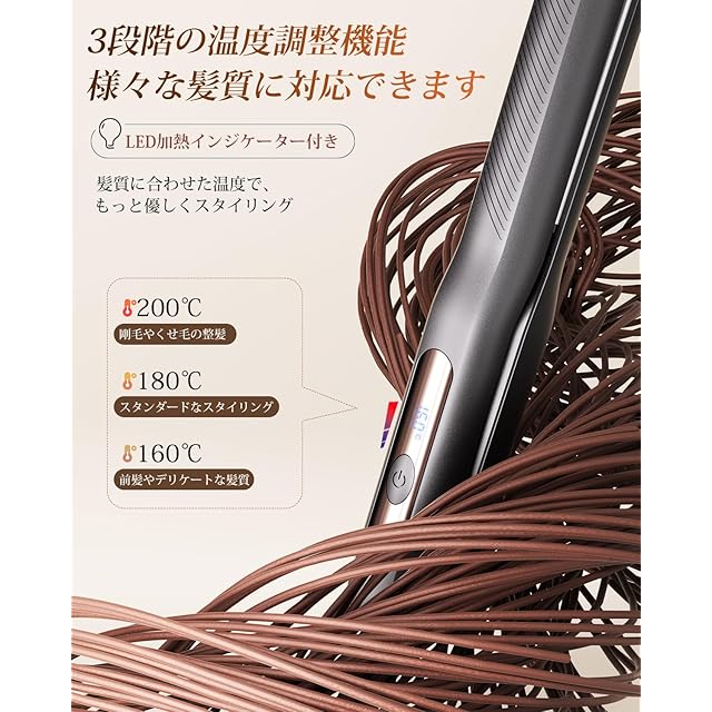 【3段階温度調整&自動OFF機能】3段階の調節機能が付いているので、髪質に合った温度を選ぶことができます。160℃設定は前髪やデリケートな髪質向け、180℃はスタンダードなスタイリングに、200℃は剛毛やくせ毛の整髪に最適です。自動電源オフ機能を搭載、電源を入れてから約20分間操作しないと、自動的に電源がOFFとなります。高い耐熱性と難燃性を備えた材質を使用しているため、製品寿命が長く、使用時の安全性を確保。