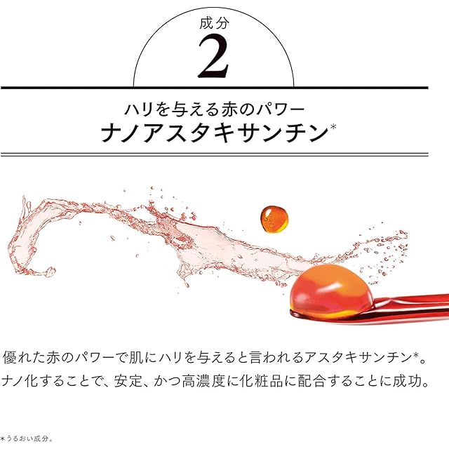 【ハリを与える赤のパワー ナノアスタキサンチン*4】優れた赤のパワーで肌にハリを与えると言われるアスタキサンチン*4。ナノ化することで、安定、かつ高濃度に化粧品に配合することに成功。【注釈】*4 うるおい成分