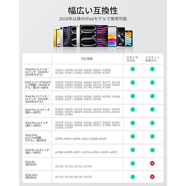 【対応機種】:2025年新型iPad 11インチ(A16)&iPad Air 11インチ(M3)、iPad Pro 11インチ&13インチ(M4)、iPad 10/9/8/7/6世代、iPad Air 11インチ/13インチ(M2)、iPad Air 5/4/3世代、iPad Pro 11インチ 4/3/2/1世代、iPad Pro 12.9インチ 6/5/4/3世代、iPad Mini 6/5/7(A17Pro)。