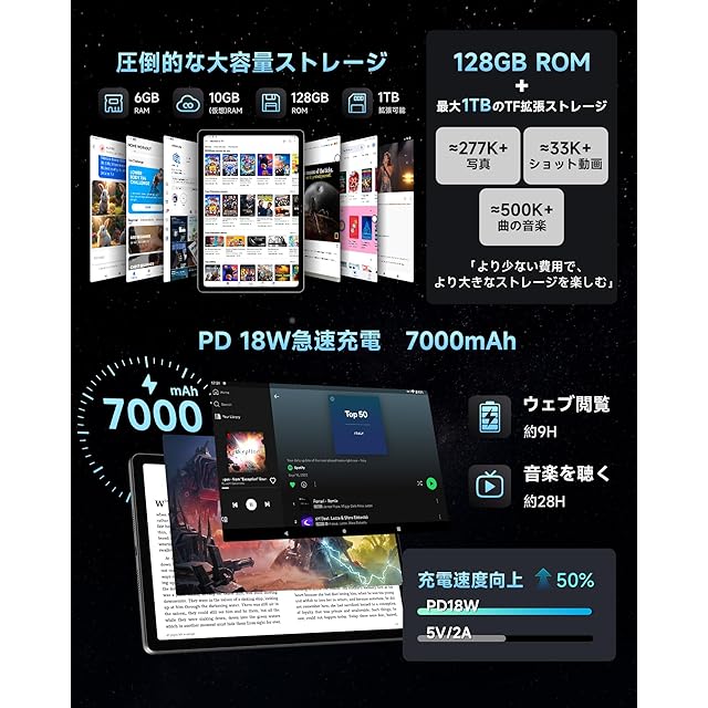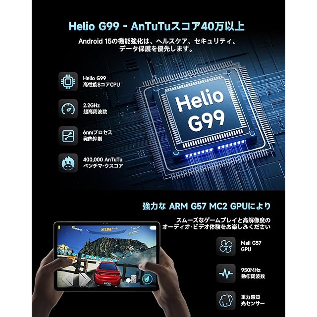 【Helio G99高性能CPU&16GB+128GBストレージ】 MediaTek製G99 8コアCPUを搭載。G99は、2つの高性能A76コアと6つの省電力A55コアを備え、最大2.2GHzのクロック周波数でスムーズな動作を実現。さらに、最新のAndroid 14システムを採用し、AnTuTuベンチマークスコアは40万点以上を記録しました。T606プロセッサーと比較して、より高いベンチマークスコアと高速なマルチタスク処理性能を実現します。16GB RAM(6GBのLPDDR4X物理メモリ+10GBの仮想メモリ)と128GB ROMを組み合わせ、さらにTFカードで最大1TB(別売り)まで拡張可能です。これにより、マルチタスクやゲームがよりスムーズに動作します。GMS認証も取得しており、Google Playストアから数百万種類のアプリを無料でダウンロード&インストールできます。