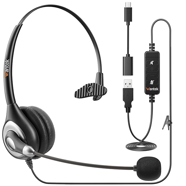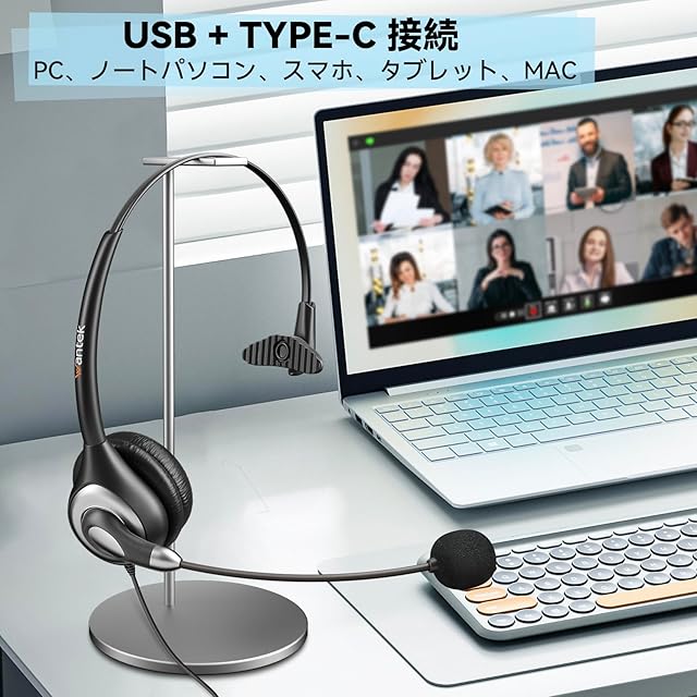 WantekヘッドセットUSB Type-C 片耳 ノイズキャンセリングマイク付き 音量調節コントローラー有線PC用ヘッドホン Web会議、Skype、オフィス、在宅勤務、業務用、リモートワーク、オンライン授業、コールセンターに適用 クリアな通話 超軽量 超快適 【適格請求書発行対象】