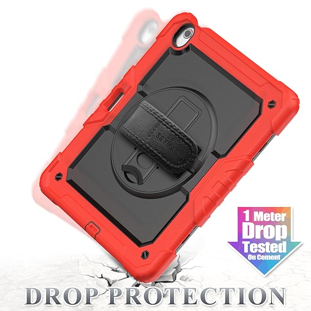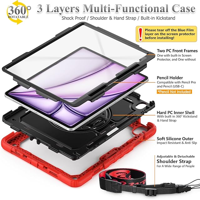 SEYMAC stock 2024年 13インチiPad Air(M2)耐衝撃ケース 保護フィルム付き ペン収納 360°回転スタンド ハンドストラップ ショルダーストラップ 全面保護カバー iPad Air 13 2024専用型(レッド)
