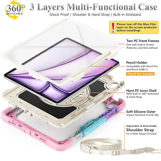 SEYMAC stock 2025年/2024年 13インチiPad Air(M3/M2)耐衝撃ケース 保護フィルム付き ペン収納 360°回転スタンド ハンドストラップ ショルダーストラップ 全面保護カバー iPad Air 13 2025/2024専用型(色とりどり+ピンク)