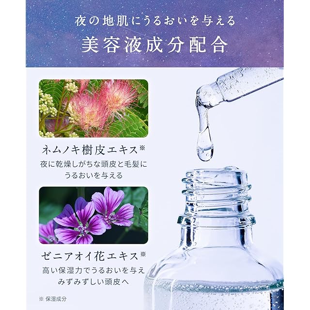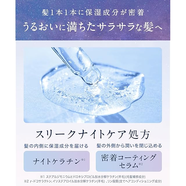 【シャンプー・トリートメント】髪と地肌の濃密ナイトケアで、すんなりうるサラ髪へ <睡眠中の摩擦ダメージから髪を守る> point1 スリークナイトケア処方 ・ナイトケラチン※1:髪内部に浸透し、指通りの良い素直な髪に導く + ・密着コーティングセラム※2:外側から密着して毛髪をコーティング point2 地肌に潤いを与える美容液成分配合 ・ネムノキ樹皮エキス※3 ・ゼニアオイ花エキス※4 point3 安らぎたい夜に ペアー&ゼラニウムの香り ☀日中のダメージも保湿&毛髪補修ケア [ 熱 ] [ カラー ] [ 紫外線等による乾燥 ] ※1 ステアルジモニウムヒドロキシプロピル加水分解ケラチン(羊毛)(毛髪補修成分) ※2 γ-ドコサラクトン、イソステアロイル加水分解ケラチン(羊毛)、リン脂質(全てヘアコンディショニング成分) ※3,4 保湿成分 [ シリコン、パラベン、鉱物油、合成着色料フリー ]