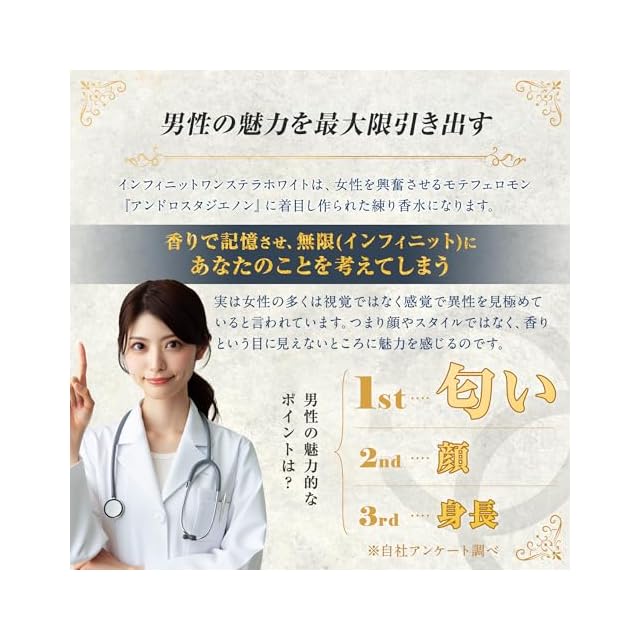 男性の魅力を最大限引き出す インフィニットワンステラホワイトは女性を興奮させるモテフェロモン『アンドロスタジエノン』に着目し作られた練り香水になります。 香りで記憶させ、無限(インフィニット)にあなたのことを考えてしまう 実は女性の多くは視覚ではなく感覚で異性を見極めていると言われています。 つまり顔やスタイルではなく、香りという目に見えないところに魅力を感じるのです。 男性の魅力的なポイントは? ※自社アンケート調べ 1位匂い 2位顔 3位身長
