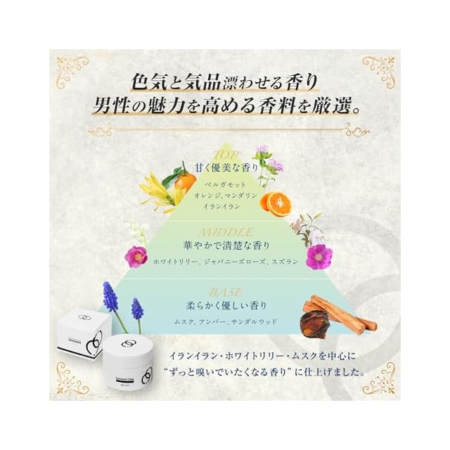 色気と気品漂わせる香り 男性の魅力を高める香料を厳選。 Top: ベルガモット、オレンジ、マンダリン、イランイラン 甘く優美な香り Middle: ホワイトリリー、ジャパニーズローズ、スズラン 華やかで清楚な香 Base: ムスク、アンバー、サンダルウッド 柔らかく優しい香り イランイラン・ホワイトリリー・ムスクを中心に“ずっと嗅いでいたくなる香り”に仕上げました。