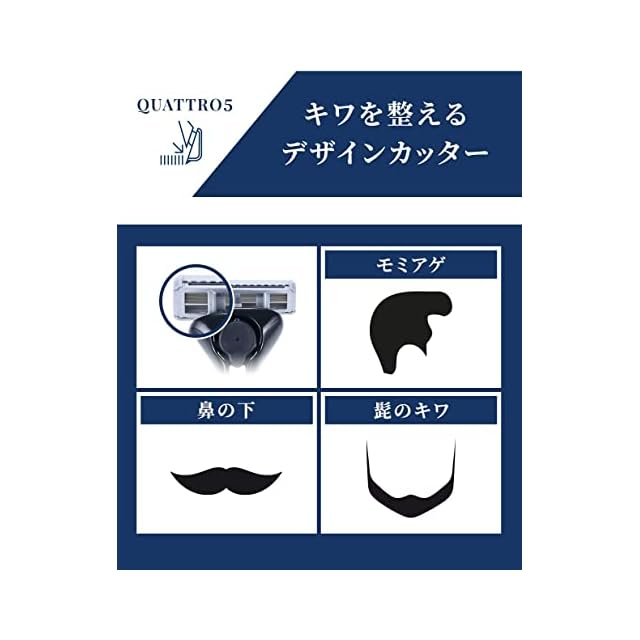 より深く、より快適に剃れる5枚刃。※刃と刃の間隔を狭めた設計の替刃を採用することで、狭いところも剃りやすいコンパクトヘッドを実現※クアトロ4と比較