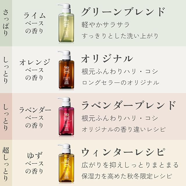 【累計販売本数800万本突破(※)】人気のリンス不要オールインワンシャンプー「haru」kurokamiスカルプの香り違い「ラベンダーブレンド」。発売直後に即完売した人気の香りです。 ※リニューアル前商品、限定シリーズ、kurokamiスカルプシリーズ3種類含む2025年10月時点メーカー出荷実績。自社調べ。 【髪も地肌もやさしくケア】うねり、ハリ・コシ、フケ・かゆみなど、髪と地肌の悩みをまとめてケアできるよう開発したシャンプーです。天然由来の美容成分をたっぷり配合、しなやかにまとまり、使うほどに自信が持てる髪へと導きます。 【3種のアミノ酸(※)&濃密泡できしまない】大きさの異なる3つの泡を泡立ちが良くなる黄金比でブレンド。弱酸性のアミノ酸を配合した濃密泡が、必要以上にうるおいを落とさずしっかりとした洗いあがりを実現しました。 ※グルタミン酸Na、グリシン、アラニン(保湿成分) 【心ゆるめるラベンダーベースの香り】合成香料不使用、天然精油100%。ほっと一息ついて心をゆるめるひとときのために、リラックスしたいときに使う方が多いラベンダー油を中心に、6種類の精油(※)をバランスよくブレンドしています。ヘアケアの時間を、心も癒す至福の時間にしませんか。 ※ラベンダー油、アオモジ果実油、オレンジ油、グレープ、フルーツ果皮油、オレンジ果皮油、ライム油 【100%天然由来・10の無添加(※)】敏感な女性の地肌を考えて、約500種類の素材から厳選した天然由来成分のみを使用。髪にも地肌にもやさしく使えるよう想いを込めて、100%天然由来で10の合成成分無添加(※)で作られたシャンプーです。 ※シリコン、合成ポリマー、カチオン界面活性剤、鉱油物、石油系界面活性剤、合成香料、合成着色料、紫外線吸収剤、合成防腐剤、合成保存料が無添加