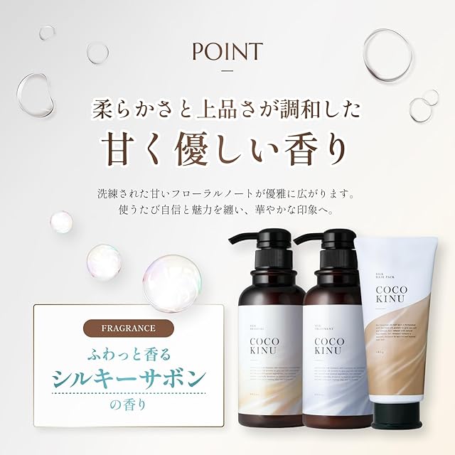 シャンプー トリートメント セット として独自で処方したシルク成分とアミノ酸が髪の内部まで浸透することでダメージを補修し、美容室帰りのようなしっとりとした手触りと滑らかな髪に導きます。