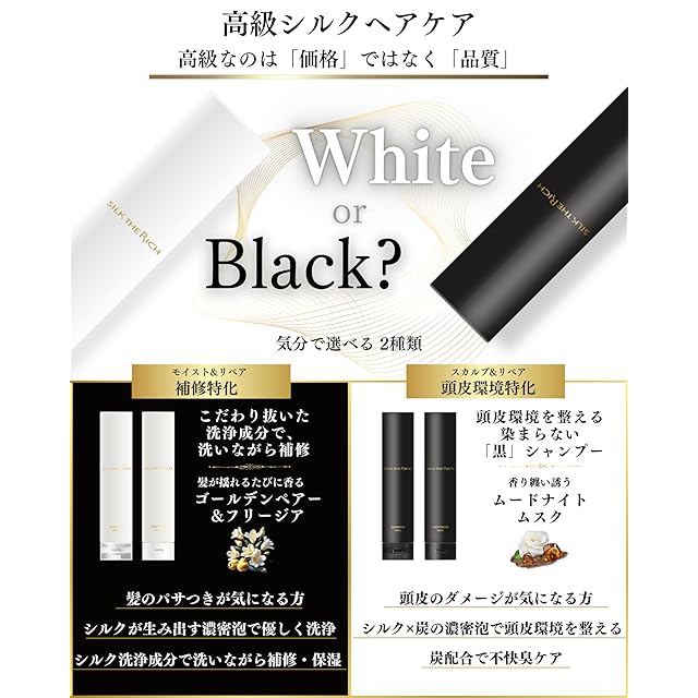 【SILK THE RICH シルクザリッチ】「自宅で続ける高級サロンヘアケア」を目指して開発されました。美容室専売品を超えるクオリティを追求。3種類のシルク成分を配合した髪質補修 シャンプー トリートメントです。メンズ、レディース問わず使える質感と香りで、ダメージヘアはもちろん、においやフケが気になる方にもお勧めです。