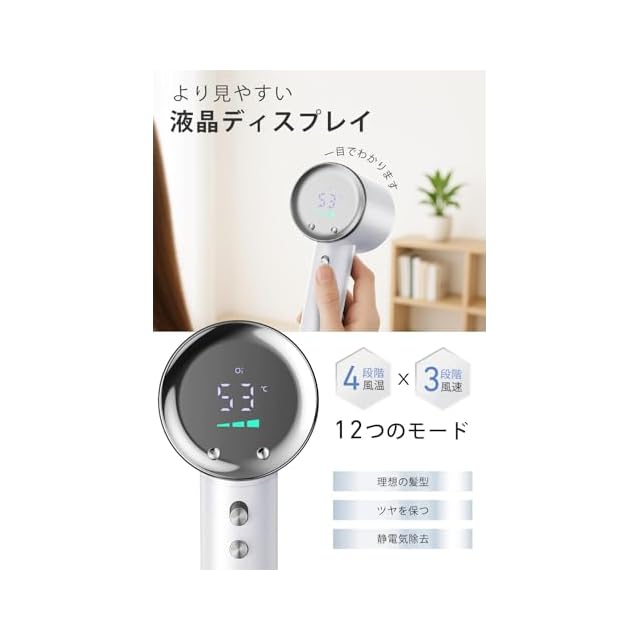 ▶【スマートディスプレイ搭載|12モード自由調整】 進化型ヘアドライヤーは温度・風量・イオンをリアルタイム表示。4段階温度×3段階風速=12種類のモードで、自分好みのスタイルを自在にアレンジ可能。冷風モードでは室温風をそのまま提供し、仕上げのスタイリングにも最適。さらにメモリー機能で前回設定を記憶するため、毎回操作不要。サロン帰りのような質感を手軽に再現できます。