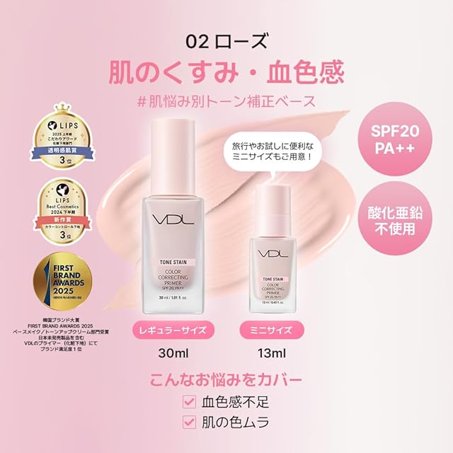 商品名:VDL(ヴィディーエル) トーン ステイン カラー コレクティング プライマー 02 ローズ 化粧下地 コントロールカラー トーンアップ くすみ ピンク 血色感 高保湿 韓国コスメ トライアルサイズ 13ml SPF20 PA++ 【ミニサイズ】