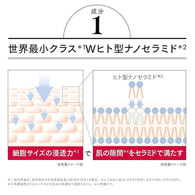 【主な成分1 うるおいを保つWヒト型ナノセラミド*1】ハリやうるおいに満ちた肌を保つには、土台*2となるセラミドのケアが大事。 独自のナノテクノロジーでセラミドを極小化することで、高浸透*3を実現。 【注釈】*1 うるおい成分(セラミドEOP、セラミドNP、セラミドAP) *2 しっかりとしたお手入れという意味 *3 角層まで。当社比 【ご使用方法】①適量パール粒大を手に取り、手のひらでジェリーを軽く伸ばす。②手のひらで顔全体をあたためるように包み込み、ジェリーを肌になじませる。