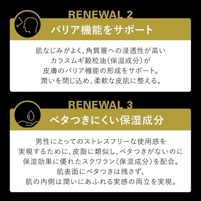 【製品の特長】肌に触れた瞬間、ウォータリーなテクスチャーに変化する”ウォーターブレイク処方”で、ベタつきにくい自然な保湿膜を形成し、敏感になりがちな素肌を守る高保湿乳液。肌のベースを整える美容成分※が肌のバリア機能をサポートし、肌トラブルや年齢に負けない、柔軟でハリのある潤い溢れる肌に導きます。 【男性に特化した開発】肌荒れ、乾燥、テカリ、髭剃り負けなどの「今の悩み」と「将来の肌ためのメンテナンス」の両方にアプローチできるケアを目指して、年齢や肌質を問わず使い続けることのできる機能と効果実感を追求しました。 【男性の肌の特徴】男性の肌は、紫外線や大気汚染、生活習慣、髭剃りなどにより常にストレスを受け続けている他、男性ホルモンの影響で皮脂量が多く女性よりも水分量が少ない傾向があるため、肌の水分・油分のバランスが崩れやすいため、適切なケアが必要です。 【使用感】肌の水分・油分のバランスを整える、濃厚なのにベタつきにくい保湿膜で、柔軟さとハリのある明るい肌に仕上げます。10円玉大程度を取り、手のひらで温めるように全体に広げ、こすらないように顔全体に優しくなじませてください。肌がもっちりしてきたら、乳液が角質層まで浸透し、スキンケアが完了した合図です。 【製品について】肌を保湿して乾燥によるトラブルを防ぐ「8種類の天然由来の美容成分」や肌が本来持つ力を高める「トリプルサッカライド」を配合。10つのフリー「エタノールフリー、パラベンフリー、鉱物油フリー、合成着色料フリー、石油系界面活性剤フリー、紫外線吸収剤フリー、シリコンフリー、石油系油剤フリー、サルフェートフリー、マイクロプラスチックビーズフリー」