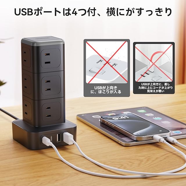 電源タップの多機能性で、デスク周りをスッキリと! デスク周りがごちゃつくお悩み、ありませんか? 従来の延長コードや電源タップとは一線を画す、タワー型電源タップがその悩みを解決します。 電源タップ タワーとは? コンパクトでスタイリッシュなデザイン:ミニ型のタワーデザインで、限られたスペースでも邪魔になりません。 多様なコンセントに対応: ACコンセントはもちろん、USB-A、USB-Cなど、様々な機器に対応。スマホの充電からパソコンまで、これ一台でまとめて充電できます。 安全機能も充実: 雷ガード、過電流保護など、大切な機器を守るための機能が満載。 ケーブルの長さやコンセントの数も豊富: お部屋のレイアウトや使用する機器に合わせて、最適なものを選べます。 なぜコンセントタップが選ばれるのか? デスクスペースを有効活用: 机の上に置いても、床に置いても、場所を選びません。 ケーブルの絡まりを防止: コンセントが上向きについているので、ケーブルが絡まりにくく、スッキリとした配線が可能。 見た目もすっきり: デスク周りをすっきりさせ、作業効率アップに繋がります。 安全性も考慮: 雷ガード付きの製品を選べば、突然の落雷から機器を守ることができます。 どんなシーンで役立つ? オフィス: デスク周りをスッキリさせ、集中力を高めたい方。 家庭: リビングや寝室など、様々な場所で活躍。 テレワーク: ノートパソコンや周辺機器をまとめて繋ぎたい方。 豊富なラインナップ テーブルタップの数: 12個AC口&2USB-A&2USB-Cポート、ご自身の使用状況に合わせてお選びいただけます。 ケーブルの長さ: 延長コード 2m、電源タップ 3m、延長コード 5mなど、様々な長さの製品をご用意。 デザイン: ホワイト、ブラックなど、インテリアに合わせたデザインも。 機能: USB急速充電対応、個別スイッチ付きなど、様々な機能を搭載した製品も。 まとめ 電源タップ USB付きは単なる電源タップではありません。デスク周りの収納力、安全性、デザイン性を向上させる、多機能なアイテムです。 この機会に、ぜひタワー型電源タップをお試しください。