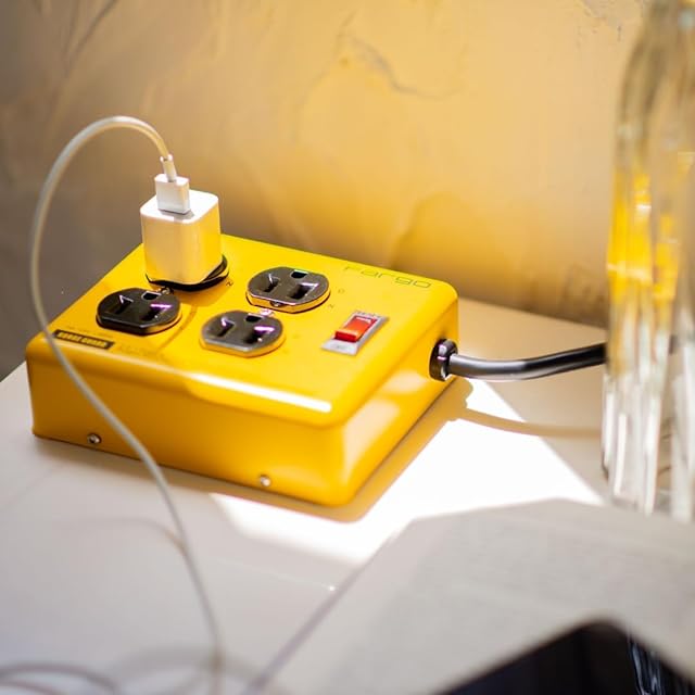 商品名:Fargo 延長コード 4個口 雷サージ 一括スイッチ付 STEEL TAP スチールタップ ファーゴ 電源タップ 鉄製 おしゃれ インテリア DIY ガレージ イエロー 黄色 1.8m