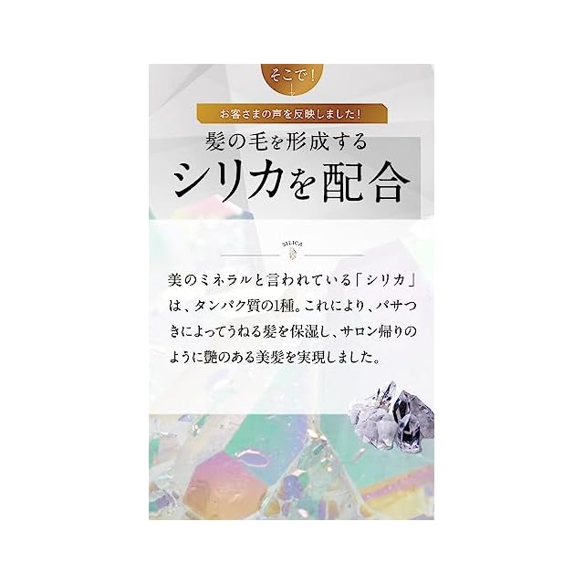 ✨1本6役のオールインワンシャンプー:キューティクル補修、ツヤ・ボリュームアップ、頭皮ケア、コンディショナー不要、静電気・乾燥予防、ダメージ補修をこれ1本で叶えるオールインワンシャンプーです。これ1本でエイジングヘアケア* が完了します。 *年齢に応じたケアのこと ✨美のクリスタル「シリカ」配合:美のミネラルと言われている「シリカ」を配合。貴重なタンパク質の1種で、女性の美しさをサポートします。シリカでケラチンをサポートし、誰もが振り返りたくなるような艶やかでハリコシのある美髪へ導きます。