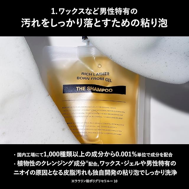 【男性の肌の特徴】素早い泡立ち、汚れをしっかり絡め取る濃密な泡質、少量でも根こそぎ汚れを落とすほどの洗浄力、泡切れの良さ、頭皮と髪への優しさ、これら全てに満足するシャンプーを目指して開発しました。