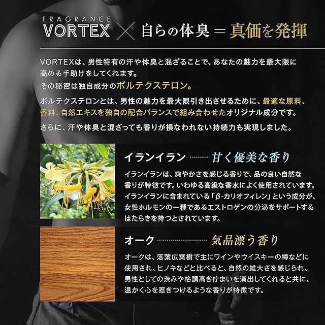 ・女性は匂いを最も重視する!?基本的に男性は視覚、女性は感覚が優れていると言われています。 その為、男性と違って女性は匂いによって、男性の本来持ち合わせている魅力を見極めているのです。 ・では、なぜ女性は男性と違って香り重視するのか? それは、男性の魅力を高める成分「アンドロスタジエノン」に反応しているからなのです。 その成分に着目し、開発されたのが「VORTEX」なのです! ・独自成分『ボルテクステロン』 VORTEXは、男性特有の汗や体臭と混ざり合うことで設計された最先端の男性用フレグランスミストなのです。 その秘密は独自成分のボルテクステロン。 ボルテクステロンとは、その人が本来持っている魅力を最大限引き出すために、最適な原料、香料、自然エキスを独自の配合バランスで組み合わせたオリジナル成分です。 ・どんな香り? VORTEXの香りは、イランイラン、オークの成分を独自の製法で混ぜ合わせることにより、甘くて優美かつ気品漂う印象を受ける香りに調整しております。