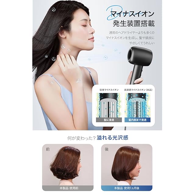 【高濃度マイナスイオンでうるツヤ髪へ】 最新のマイナスイオンドライヤーは、高性能イオン発生器と半導体冷却装置を搭載。数千万個のマイナスイオンを放出し、静電気を抑えて広がりや切れ毛を防ぎ、まとまりのあるサラサラな髪へ導きます。さらに、微粒子イオンがキューティクルに浸透し水分保持力を高め、髪にしっとり潤いを与えます。