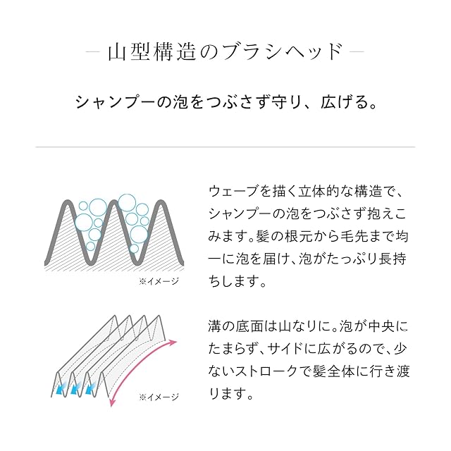 山形構造になった2種のピンが、髪と頭皮にたっぷりの泡を行き渡らせながら、摩擦レスで心地よい刺激を与え、頭皮の細かい汚れもオフします。