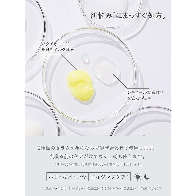 植物レチノール「バクチオール(*4)」と「レチノール誘導体(*5)」「レチノール(*3)」のトリプル効果で肌のハリ感や毛穴目立ち(*6)、くすみ(*6)などに悩む大人肌を多角的にケアします。