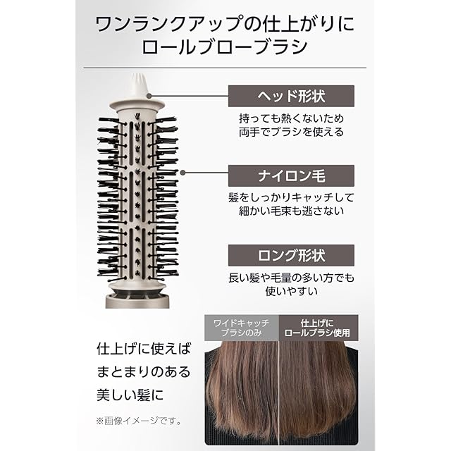 幅広のワイドキャッチブラシと、ピンと植毛が360度に配されたロールブローブラシが付属。ブラシを使い分けることで、ボリュームアップさせたヘアスタイルや、クセを伸ばし髪を整えるブローのニーズに応えます。