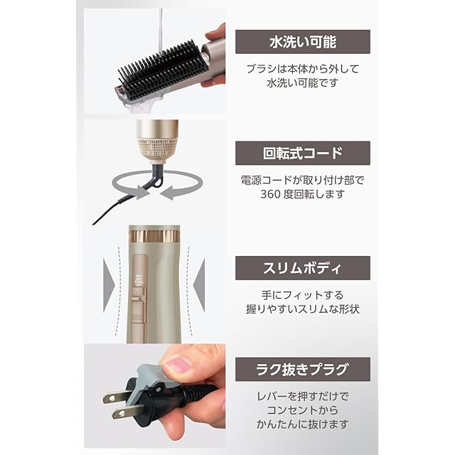 ■外形寸法:幅約214mm×奥行約48mm高さ約53mm(本体のみ)、幅約328mm×奥行約54mm×高さ約62mm(ワイドキャッチブラシ付き)、幅約373mm×奥行約56mm×高さ約56mm(ロールブローブラシ付き) ■質量:約245g(本体のみ)、約305g(ワイドキャッチブラシ付き)、約330g(ロールブローブラシ付き) ■消費電力:700W ■電源:AC100V 50/60Hz ■スイッチ:切替スイッチ「DRY/SET/COOL/OFF」 ■搭載イオン:マイナスイオン ■付属ブラシ:ワイドキャッチブラシ、ロールブローブラシ ■海外使用:× ■ラク抜きプラグ:○ ■カラー:ゴールド ■コード長:1.7m ■パーツ:ブローブラシ(TA032829)、ロールブラシ(TA032836) ■期間:1年間