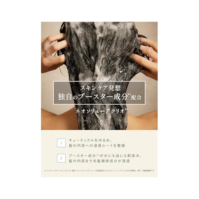 *1 加水分解シルク[毛髪補修成分] *2 シクロヘキサン-1,4-ジカルボン酸ビスエトキシジグリコール[保湿成分] *3 髪の内部まで