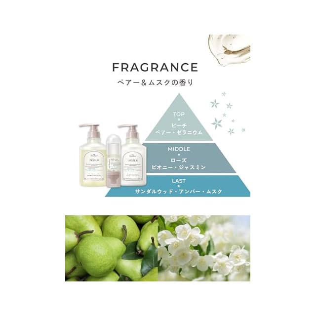キューティクルを補修し滑らかなツヤ髪へ導く、加水分解シルク(*1)配合ヘアケアシリーズ。ペアー&ムスクの香り。