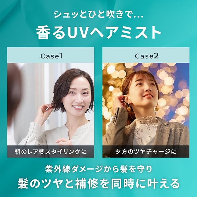 【朝のスタイリングにUVケアと至高の香りを】 朝は乾いた髪に寝癖直しとスタイリングにも使えるヘアミスト。ブラッシングや手櫛で馴染ませることでしっとりレア髪を叶えるヘアミスト。UVカット成分配合で紫外線ダメージから髪を守りながら、香りをまとうUVヘアミスト。
