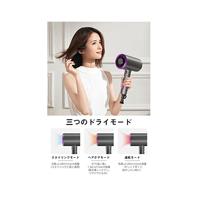 【3段階風温自由調節】3つの風温モードがあります。髪を素早く乾かすか、スタイリングするか、髪の状態やニーズに応じて自由に選択できます。子供たちでも安心して使用できる設計です。このドライヤーは、どんな髪質やスタイルにも自由自在に対応し、自信を持って外出できるようサポートします。