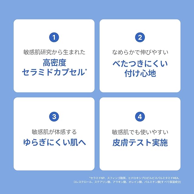 【高密度セラミドカプセル*】敏感肌研究40年から生まれた高密度セラミドカプセル*を溶かし込んで配合。伸びの良いミルクテクスチャーがすばやく馴染み、べたつきにくくなめらかな肌に。* セラミドNP、スフィンゴ脂質、ヒドロキシプロピルビスパルミタミドMEA、コレステロール、ステアリン酸、アラキン酸、オレイン酸、パルミチン酸(すべて保湿成分)