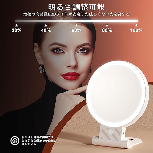 【72個LEDライト・高品質な材質】化粧ミラーの周りに72個のLEDライトを配備しており、お顔を明るく照らすことが可能です。天気や部屋の照明に関係なく、メイクを楽しめます。また、化粧鏡は耐久性のあるABSプラスチックと高品質で透明なクリスタルガラスを素材として製作されています。そのため、外観は美しくて高級感があるだけでなく、映し出される映像がクリアで、反射率も高く、顔の歪みなどの不具合も一切ないので、メイクの作業をより正確に行うことができます。