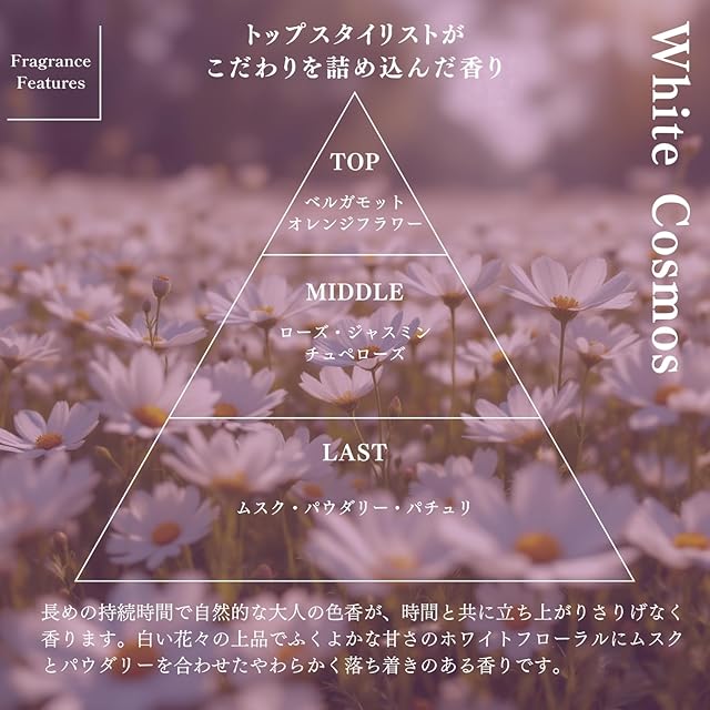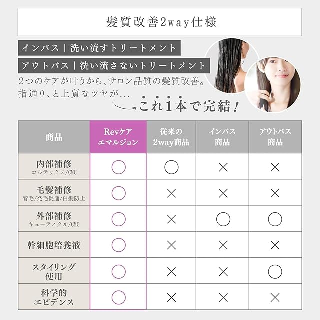 texture:毛髪を優しく包み込むこだわりのテクスチャー&スタイリング fragrance:永遠の野原に咲くホワイトコスモスとシトラスの香りを表現 technology:独自の「Revケラテクノロジー」で、髪の内外を集中ケア。