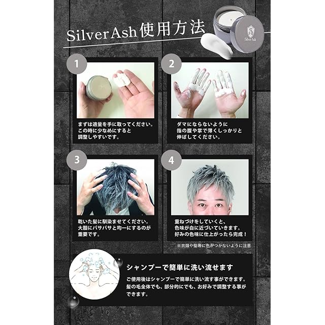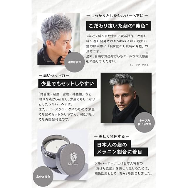 【ブリーチなし。即シルバーに!】「ワンランク上のオシャレで差をつけたい方」 「パーティーやイベントなどで”1日銀髪”を楽しみたい方」「白髪混じりの頭髪が中途 半端で気になる方」におすすめなシルバーワックスです。洗い流すまで1日シルバー カラーをキープ。シルバーアッシュのこだわりは髪に塗布した時の発色力。