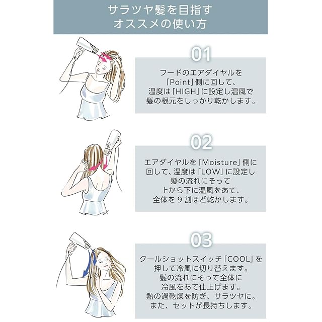 【モイスチャー】マイナスイオンと風を髪全体へ。広範囲に届けます。【ポイント】マイナスイオンと風を集中させる。髪の根元もしっかり乾かせます。※イメージ図