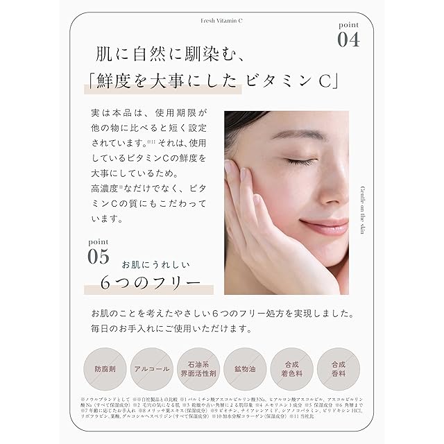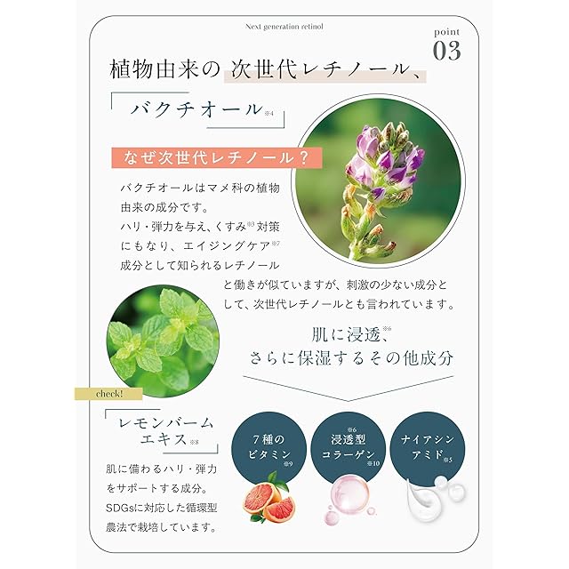 【安定化ビタミンC(*アスコルビルリン酸Na(*保湿成分))】 肌に優しく刺激を与えにくい、安定的なビタミンCです。【天然由来の植物成分もたっぷり】 3種類のビタミンCと、「次世代レチノール」こと「バクチオール(*エモリエント剤)」とレモンバームエキスを配合。肌にうるおいを与えてキメを整え、ふっくらしたハリ弾力のある肌へと導きます。乾燥によるくすみ、ハリ、弾力のなさ、キメの乱れなどトータルにエイジングケア(*年齢に応じた手入れのこと)します。 ・次世代レチノール「バクチオール(*エモリエント剤)」 レチノール代替成分として日本でもにわかに注目を集める植物由来のビタミンA。インドのマメ科植物から抽出しており「ビーガンレチノール」とも呼ばれ、肌質を問わず、日中も使用可能です。 ・保湿によりハリを与える「レモンバームエキス(*メリッサ葉エキス(*保湿成分))」 SDGsに対応した循環型農法で栽培。肌に備わるコラーゲンのサイクル機能に着目。