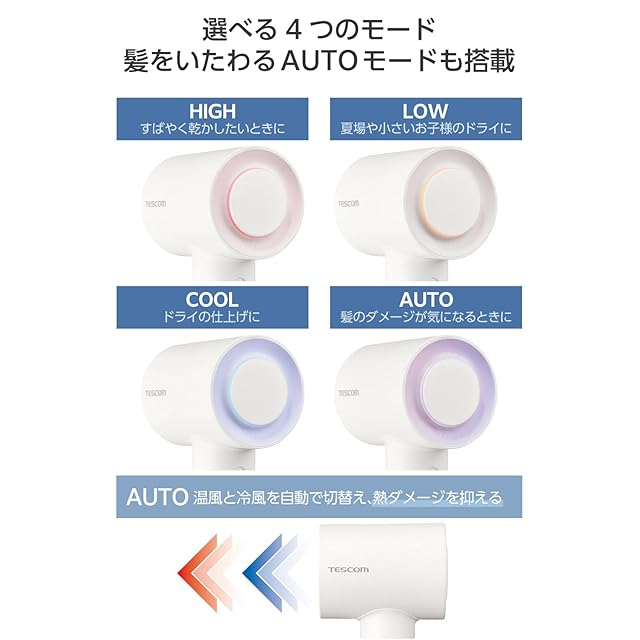 商品名:テスコム ドライヤー マイナスイオン 静音 軽量 高速ブラシレスDCモーター コンパクト 冷温風 4モード [ HIGH/LOW/COOL/AUTO ] ラク抜きプラグ ホワイト TD760A-W/E
