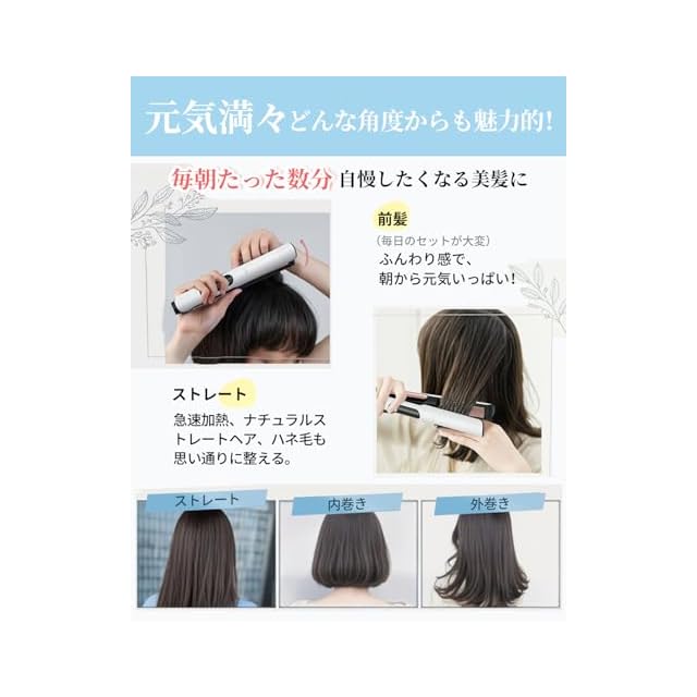 【ヘアブラシ付きの利便性&あんしん保障付き】先端の櫛歯(コーム)付きプレートが髪の絡まりを解きながら、梳かす同時に熱処理が可能。この設計で、もつれやすい髪でもスムーズに整えられ、梳きながらヘアアイロンとして、ワンステップでブローとアイロンを完了でき、時間と手間を大幅に削減します。特に朝の忙しい時間帯に効果的で、くし通りを良くしながらストレートやボリュームアップを簡単に作成。この多機能性により、従来のヘアアイロンとブラシを別々に持ち歩く必要がなく、携帯性も向上。初心者からプロまで、誰でも直感的に使えるユーザーフレンドリーな設計です。なお、期間内に万が一、初期不良やその他不具合が生じた場合は、商品ページに記載された販売元よりお問い合わせいただければ迅速に対応いたします。