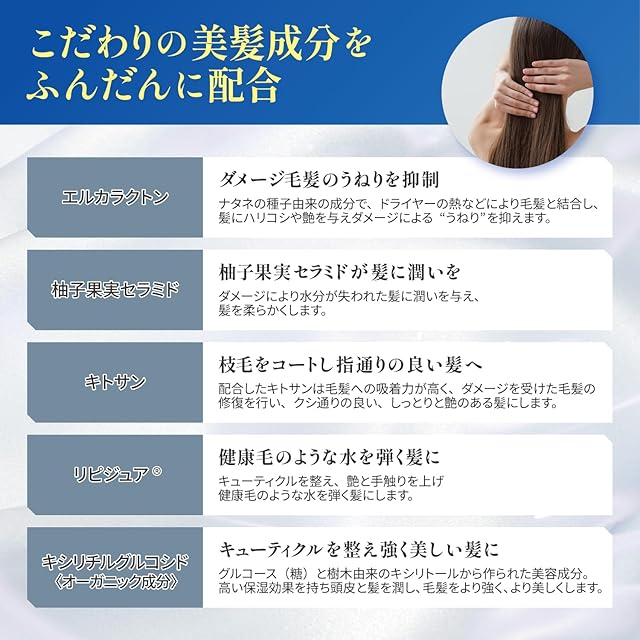 ・つるっつるでさらっさらな手触りが1日中楽しめます!! 『髪の手触りが悪くなった』 『毛先に枝毛が。。。』 『艶がなくなった』などの悩みの多くがキューティクルのダメージによるところが多いです。カラーやパーマによるダメージはもちろんの事、キューティクルにはブラッシングやタオルドライ、ドライヤーなどの日常のダメージも蓄積していきます。キューティクルがダメージを受けると艶がなくなり、 指通りが悪くおさまりの悪い髪になります。 本品に含まれる糖と樹木由来の成分がキューティクルの浮き上がりを抑え、キトサンが枝毛を補修し、リピジュアがダメージを受けたキューティクルの上でラメラ層を形成し髪を再疎水化し、つるっつるさらっさらな髪にします。