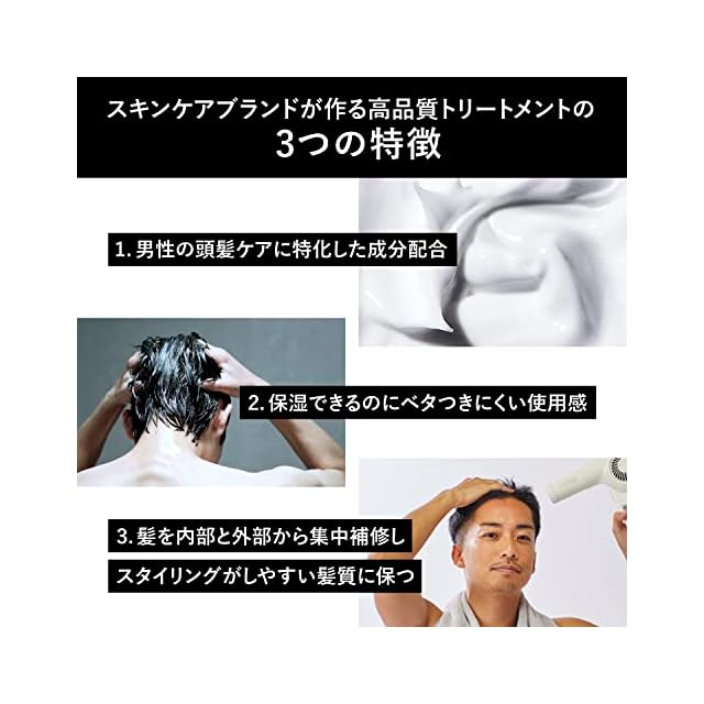"【男性に特化した開発】実は髪はとても乾燥しやすい場所です。髪は水分が失われるとキューティクルがめくれ、見た目にも傷んでまとまりのない、パサパサな印象を与えてしまいます。 男性にとって髪が健康であることは、理想の印象をキープするためには不可欠です。 そんな健康的な髪を維持するために、トリートメントの使用はとても有効的です。"