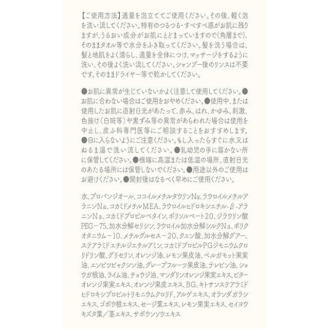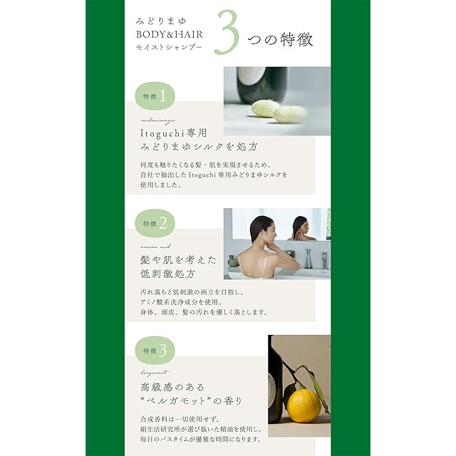 “気持ちいい”がつづく——。 みどりまゆの贅沢なうるおいを、全身で感じられるモイストシャンプー。 洗い上りはシルクのヴェールを纏ったかのように、長く深くつづく、濃密なうるおい。 もちろん、ベタつかず、つっぱりません。 肌に効果的にうるおいを残せる Itoguchi ( イトグチ ) オリジナルの成分処方だからこそ、ボディやお顔だけでなく髪のケアにも重宝します。 バスタイムを彩るやさしいベルガモットの香り 柑橘の爽やかさと甘さをあわせ持った香り。疲れた心をときほぐしたいときにもおすすめです。シャンプー、リンス、トリートメント、洗顔料、ボディソープ、全てを兼ね備えた商品です。髪のパサつきを感じる場合は、普段お使いのトリートメントやヘアオイルをご使用ください。