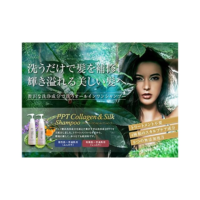 【トリートメント不要、でもきしみません】 「PPTコラーゲン&シルクシャンプー」は髪の補修などのトリートメントの働きがある洗浄成分、ココイル加水分解コラーゲンK及びラウロイル加水分解シルクNaに加えトリートメント成分ペリセア(ジラウロイルグルタミン酸リシンNa)、ヘマチン、羽毛ケラチン、加水分解コラーゲンが髪内部に浸透。髪にはり、こし、うるおいを与えることにより、トリートメントのいらない、きしまないシャンプーが実現しました。 さらに、トリートメントを使用しないことにより、節水がされ排水も汚さくなり環境にもとても優しくなります。