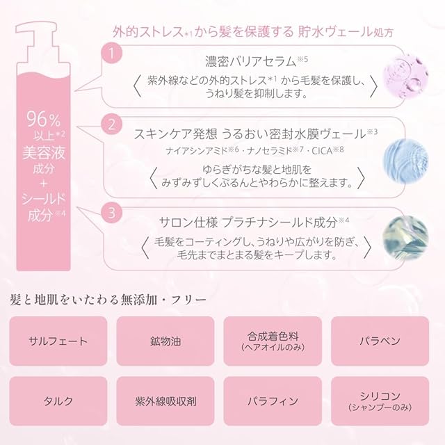 ①スキンケア発想〜髪と地肌、隙なし3段階まとまりケア〜 「整える+補う・守る+集中ケア」 ②96%以上*1美容液成分+シールド成分※1 ③肌プロテクト成分※2配合。髪と頭皮のうるおいを守りながら洗い上げ、バリア機能をサポートします。 *1 基剤を除く、水を含む ※1 加水分解ハトムギ種子、ポリクオタニウム-61、白金(全て保護) ※2 アルガニアスピノサ核油(保湿)