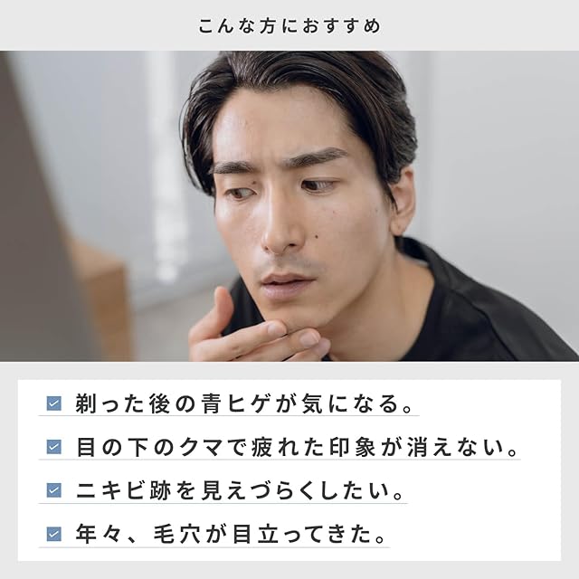 【塗っていることを感じさせない、自然な仕上がり。】初めての方にも使いやすい、伸びが良く柔らかいクリームタイプのテクスチャー。軽い付け心地で塗っていることを感じさせないほど、ナチュラルに仕上がります。目の下のクマ・青ヒゲ・毛穴やニキビなどの肌トラブル、気になる肌の悩みを自然にカバーしてポジティブな印象に。