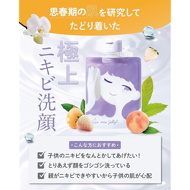 思春期のニキビ をケアするクラッシュゼリー状の洗顔料です。肌の上でクラッシュすることで、お肌に負担をかけずに古い角質や汚れ、ニキビ菌だけを吸着します。また、肌に大切な水分や保湿成分が浸透しやすくなるため、洗い上がり後もしっとりつるんとした肌へ導きます。さらに、有効成分である天然由来のグリチルリチン酸ジカリウムを配合。肌への刺激が少なく、ニキビによる赤みを抑えます。思春期のデリケートな肌を守るために、肌に不要な着色料・香料・鉱物油・パラベン・石油系界面活性剤・エタノールは使用しておりません。 <br>【内容量(1袋あたり)】150g <br>【サイズ】縦:15cm 横:9.2cm 高さ2.5cm <br>【容器】プラスチックパウチ <br>【保存方法】直射日光、高温多湿を避けて保存してください。 <br>【原材料】水、DPG、BG、グリセリン、ペンチレングリコール、グルコマンナン、ココイルグルタミン酸TEA、ラウラミドプロピルヒドロキシスルタイン、キサンタンガム、yアシ油脂肪酸PEG-7グリセリル、ジェランガム、酵母エキス、加水分解ホエイ(牛乳)、いちご果実エキス、加水分解コメヌカエキス、コメエキス、ファラエノプシスシウドングウヒシュケイ花エキス、フェノキシエタノール、ビワ葉エキス、モモ葉エキス、乳酸桿菌/コメヌカ発酵液、チャ葉エキス、ダイズ種子エキス、カプリリルグリコール、プロテアーゼ、水酸化Na、クエン酸、硫酸