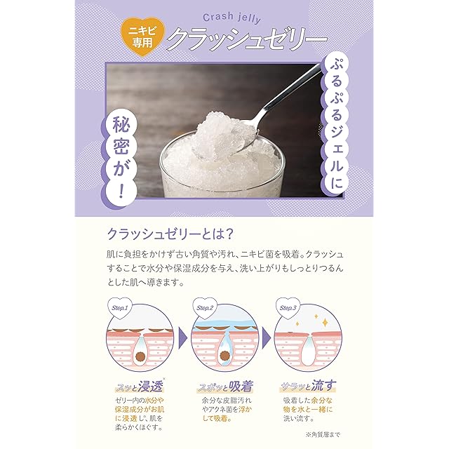 【クラッシュゼリー状の洗顔料】肌の上でクラッシュすることで、お肌に負担をかけずに古い角質や汚れ、ニキビ菌だけを吸着します。