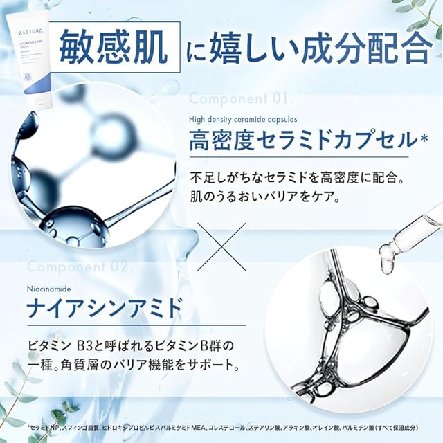 【高密度セラミドカプセル*】敏感肌研究40年から生まれた高密度セラミドカプセル*をクリーム1本80mLに約100万個配合。塗った瞬間カプセルが体温で柔らかく溶けて角質層すみずみまで満たし、肌のうるおいバリアをサポートします。* セラミドNP、スフィンゴ脂質、ヒドロキシプロピルビスパルミタミドMEA、コレステロール、ステアリン酸、アラキン酸、オレイン酸、パルミチン酸