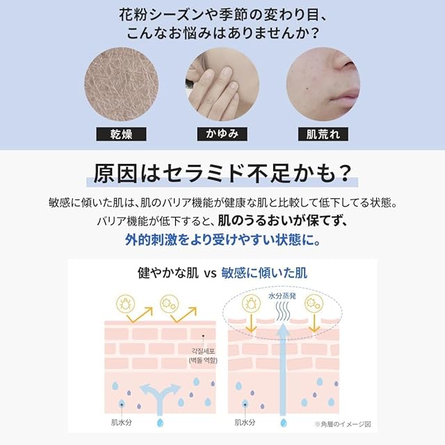 【120時間**うるおいが持続する保湿力】敏感肌に特に不足している高密度なセラミドと、コレステロールや脂肪酸といった肌にある脂質の同一成分を配合することで、セラミド単体よりも角質層になじみやすく長時間うるおいをキープします。**(株)エリード、2023.02.20~2023.03.23 敏感肌かつ乾燥悩みのある女性32人対象の人体適用試験実施。個人差があります。